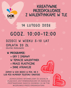 Kreatywne przedpołudnie z walentynkami w tle 6 lutego 2026 0 comments gok@besko.pl Posted in Bez kategorii Podobne posty 0 comments Bez kategorii VIII zlot pojazdów zabytkowych i silników spalinowych Czytaj więcej 0 comments Bez kategorii Warsztaty filmowe z elementami fotografii Czytaj więcej 0 comments Bez kategorii Misterium Męki Pańskiej Czytaj więcej Kreatywny koralik 2 lutego 2026 0 comments Zajęcia dla dzieci z ceramiki 8 lutego 2026 0 comments Share this About author gok@besko.pl Podobne posty 0 comments Bez kategorii VIII zlot pojazdów zabytkowych i silników spalinowych Czytaj więcej 0 comments Bez kategorii Warsztaty filmowe z elementami fotografii Czytaj więcej 0 comments Bez kategorii Misterium Męki Pańskiej Czytaj więcej 0 comments Bez kategorii Kącik kreatywny dla dzieci podczas Kiermaszu Wielkanocnego Czytaj więcej Leave a Reply Anuluj pisanie odpowiedzi Your comment Your name Your email Your website Zapisz moje dane, adres e-mail i witrynę w przeglądarce aby wypełnić dane podczas pisania kolejnych komentarzy.